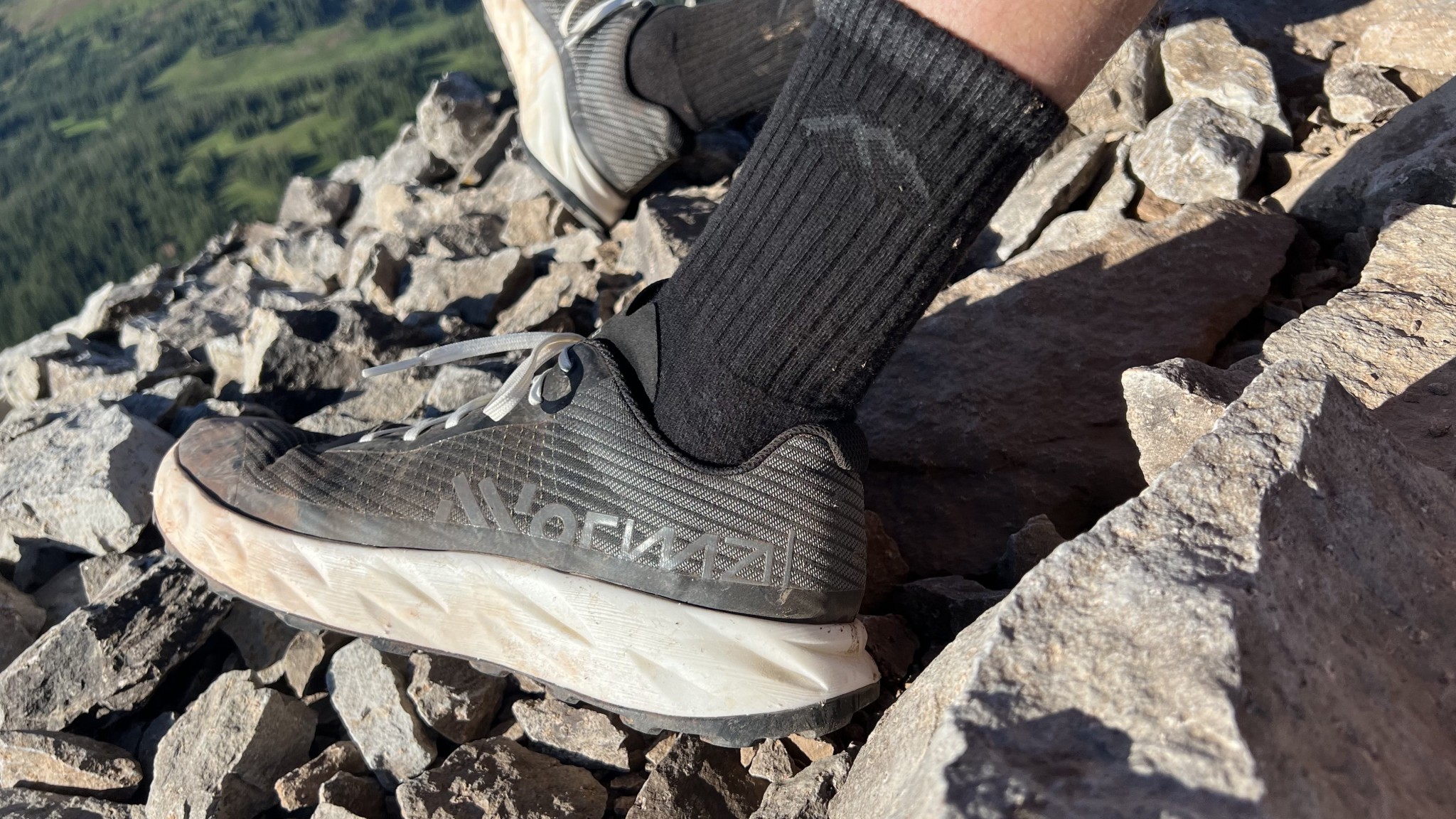 Another pair we found ourselves reaching for when the going got tough is the Nnormal Tomir 2.0. This shoe offers a truly amazing blend of speed, comfort, and traction. Both the Tomir 2.0 and the Nnormal Kjerag provide exceptional traction for their intended uses, and we enjoy running on the grippy, lightweight Vibram LiteBase outsoles (which are also found on other shoes in our lineup). The LiteBase technology allows Vibram to reduce rubber thickness while maintaining grip performance, contributing to weight savings without sacrificing traction.