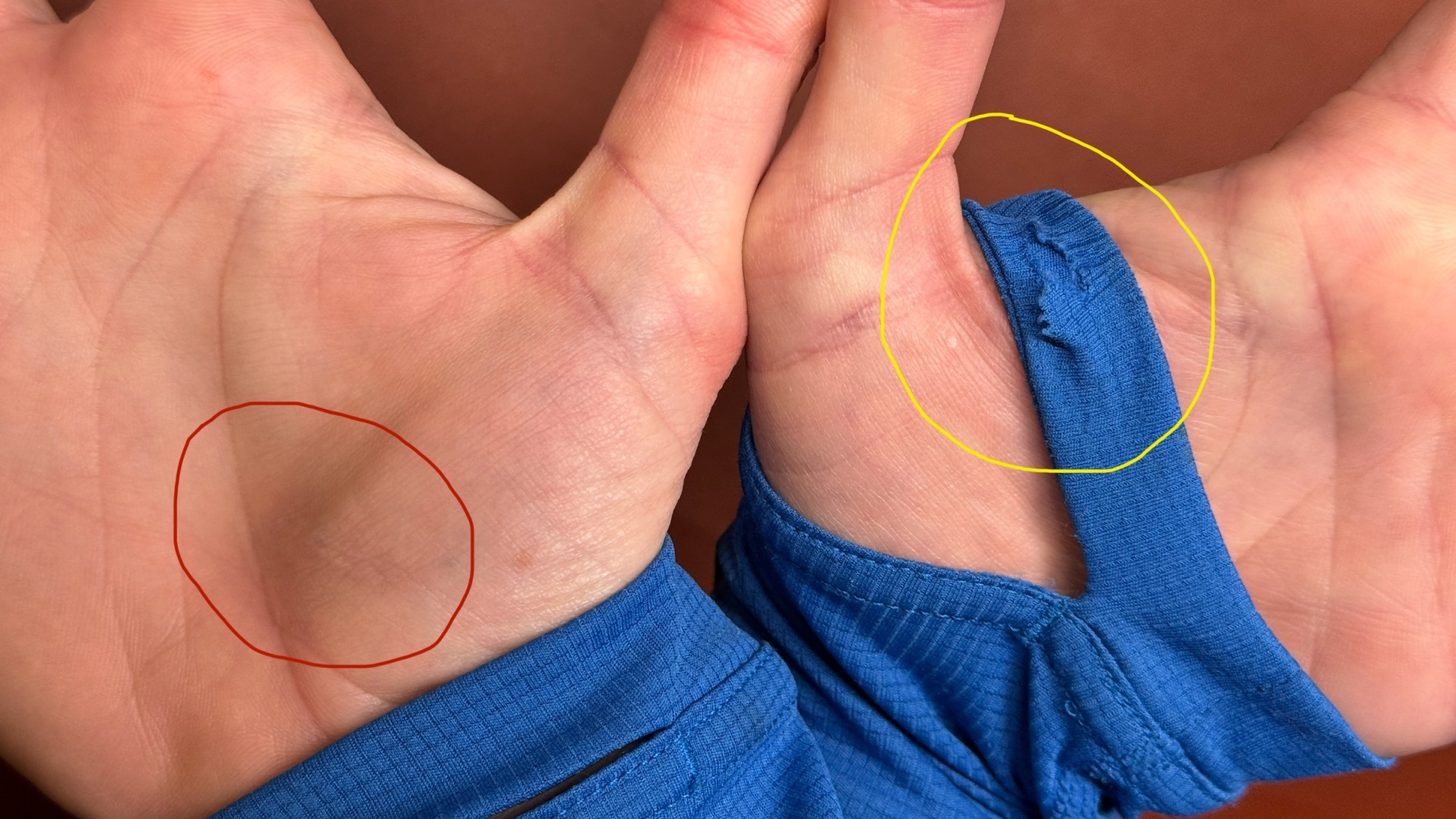 The aftermath (several months later) of a bad fall while running. On the left, a lingering scar from the accident is circled in red. On the right, the single tear in the OR Echo cuff is circled in yellow. Credit: Maggie Nichols